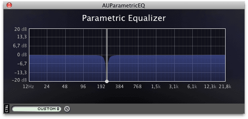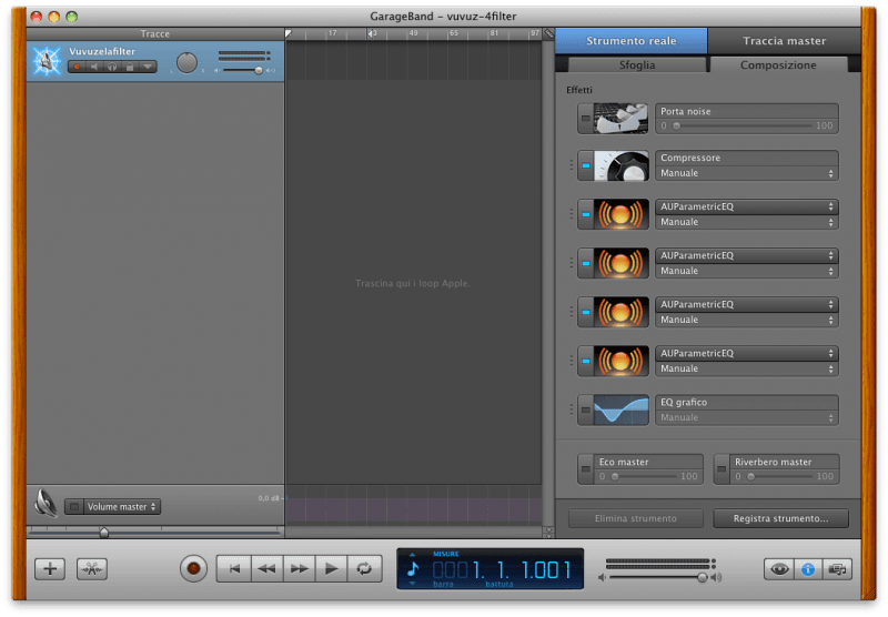 E’ sufficiente creare una nuova traccia “Strumento Reale” e sulla parte destra (tab Composizione) inserire i filtri nello stesso modo descritto sopra. Anche il modulo è esattamente lo stesso (AUParametricEQ).