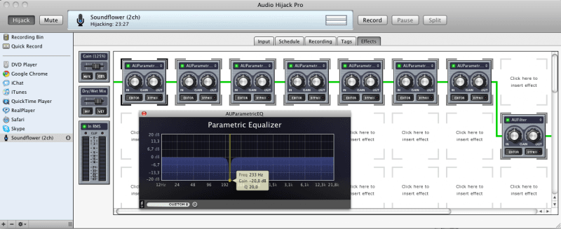 Ho trovato in rete varie soluzioni: C’è chi ha provato ad usare Logic Express, chi GarageBand, chi filtri personalizzati. I risultati migliori li ho avuti utilizzando un ottimo programma di terze parti, Audio Hijack Pro, dopo aver letto questo articolo. Ha l’unico inconveniente di essere pagamento, ma è disponibile una versione demo.