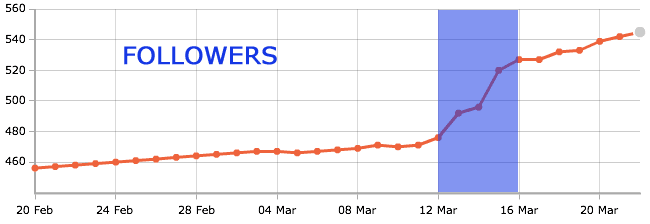 - Nei giorni successivi ho avuto molti nuovi follower: in particolare sono passato da 476 del 12 Marzo ai 542 del 21 Marzo (+ 66) , con un incremento più evidente nei primi 3 giorni, poi anche qui la situazione si è “normalizzata”