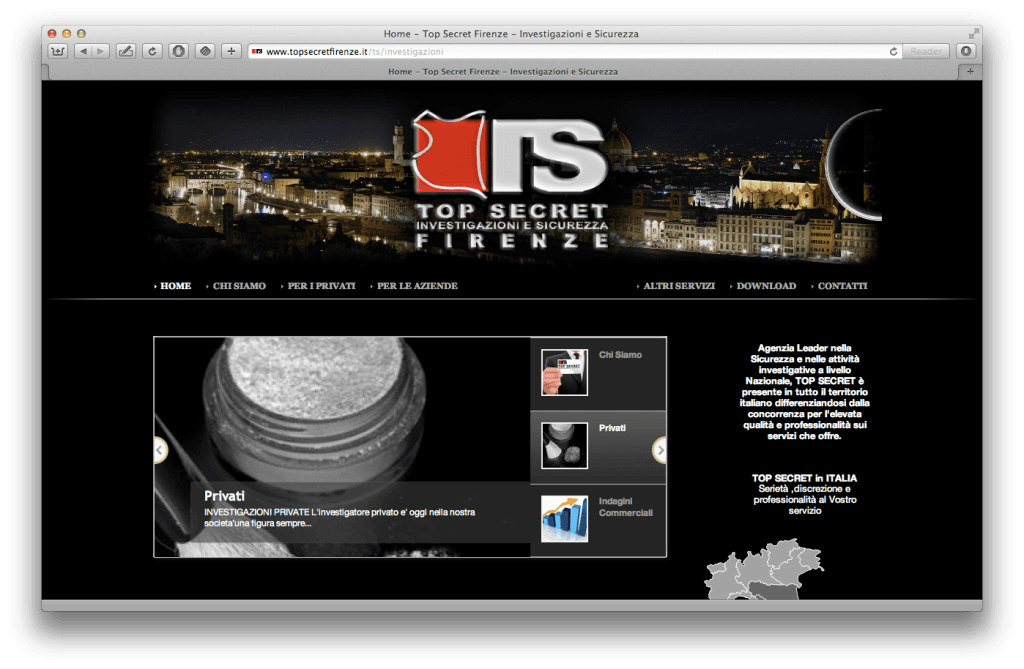 Top Secret FirenzeDate: Aprile 2012Skills: Joomla, sdoppiamento sito, galleryClient: Top Secret FirenzeLink: http://www.topsecretfirenze.itSito per un'agenzia di investigazione e sicurezza